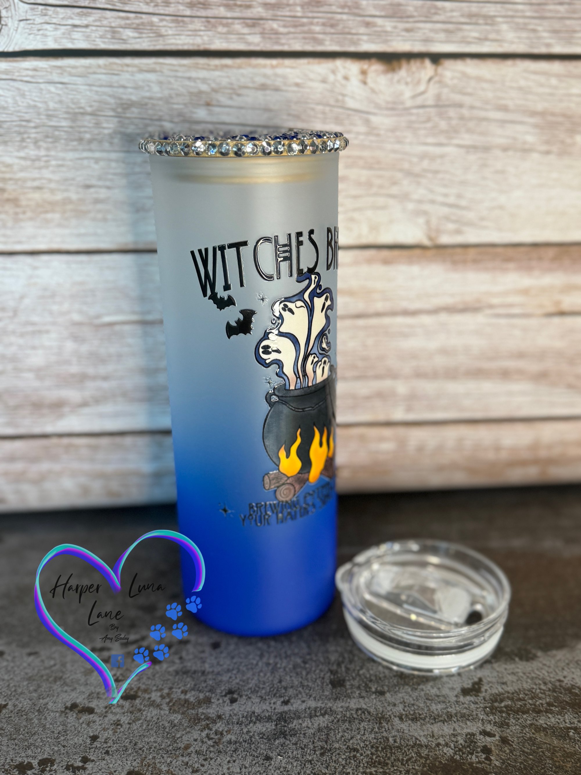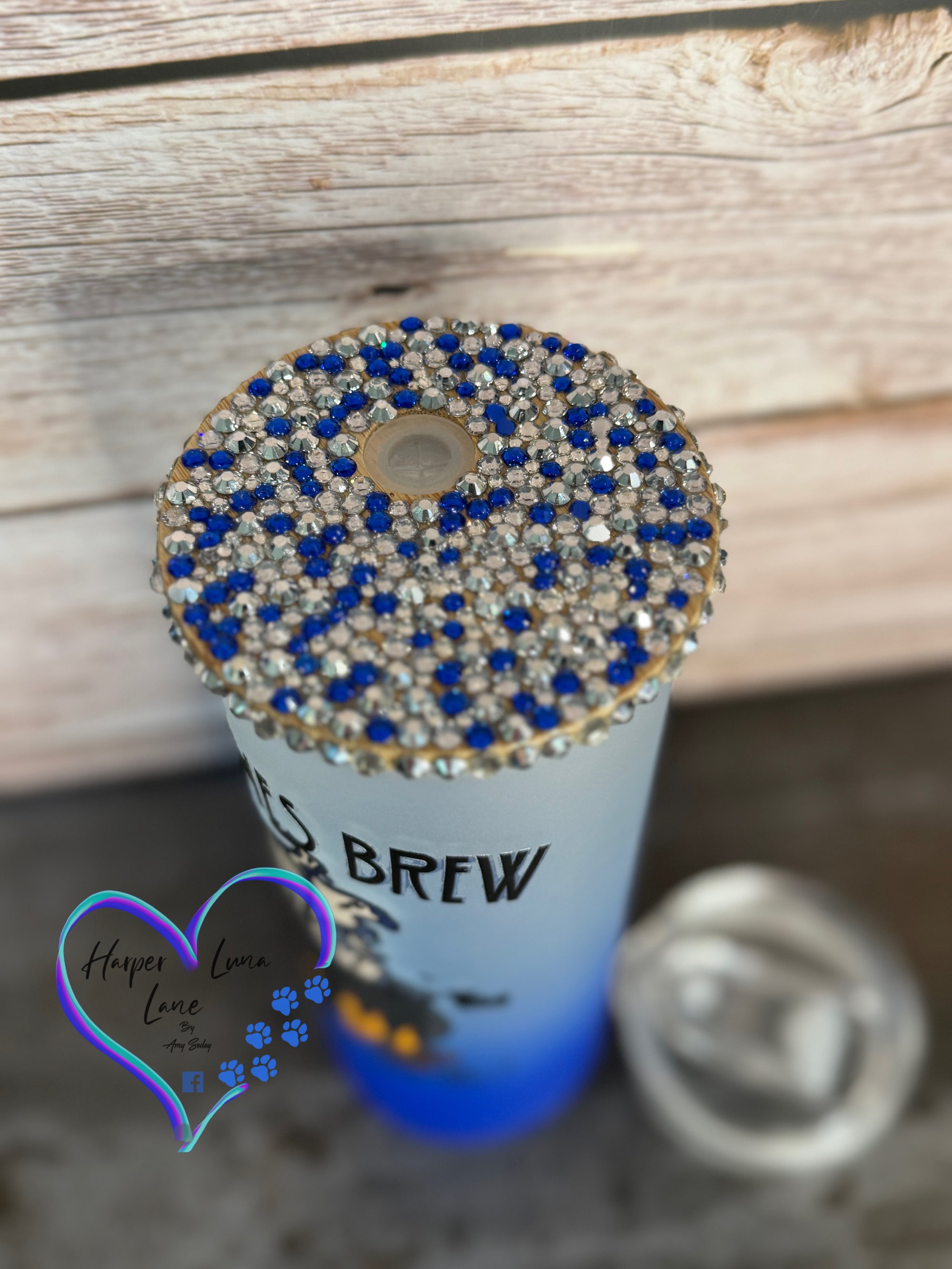 Comes with 2 lids- clear sliding lid and a rhinestone bamboo lid and clear straw