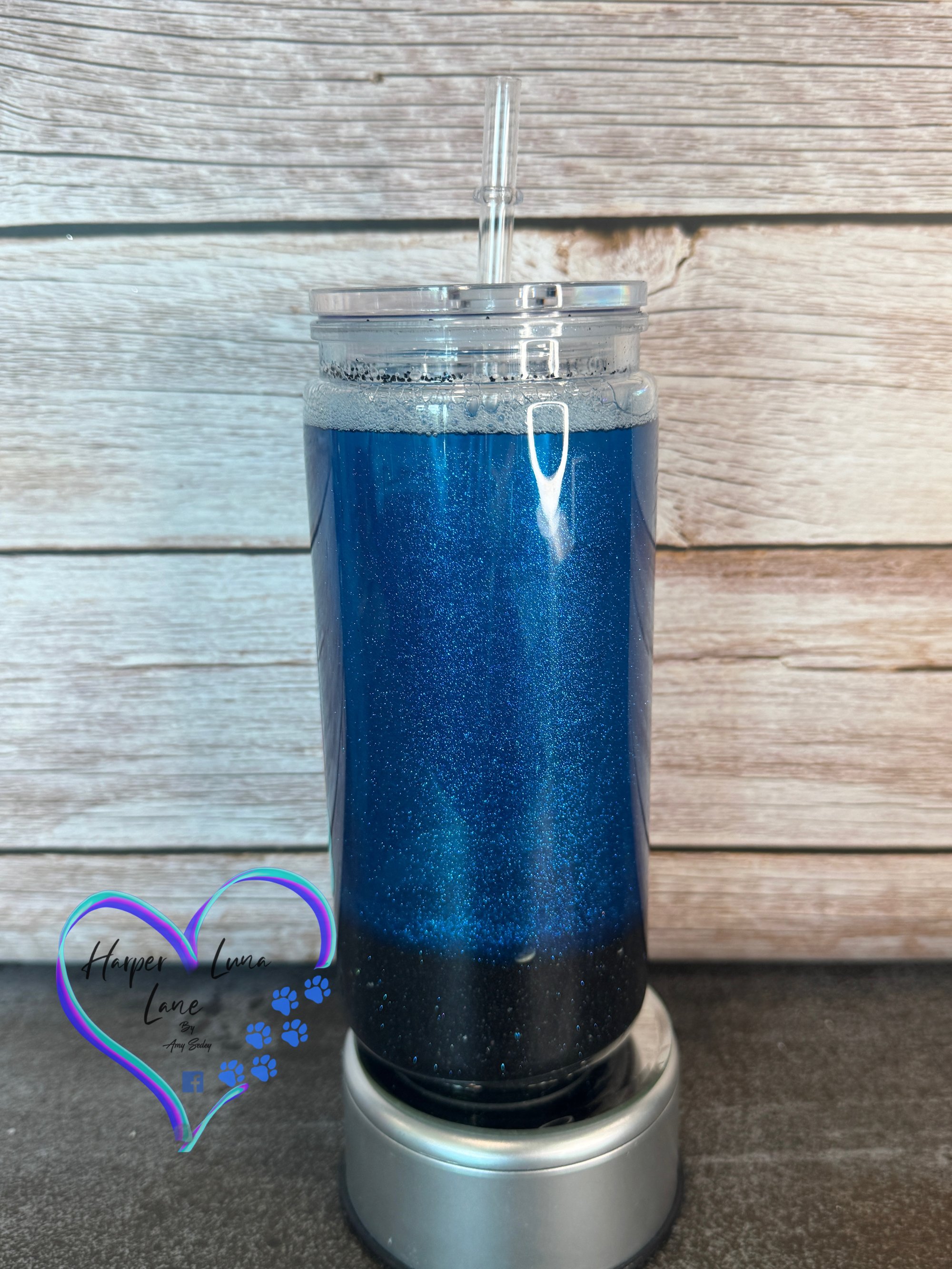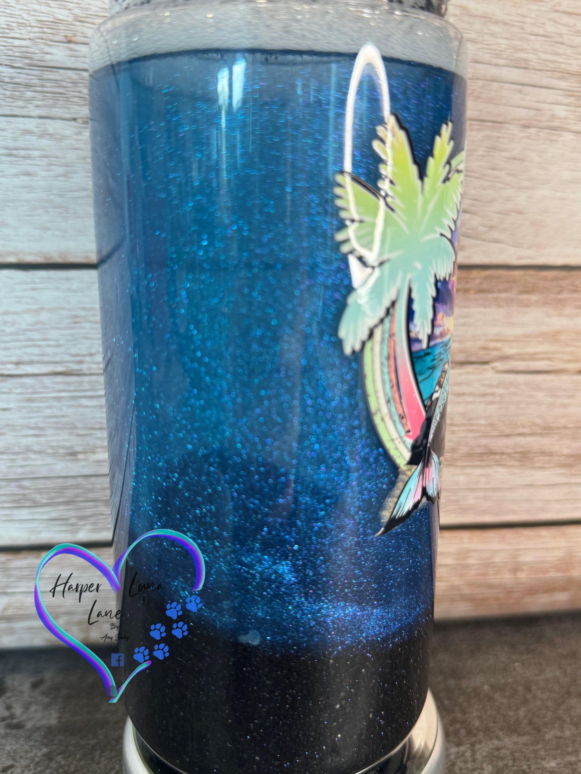 This is a unique snow globe style tumbler filled with sand, shells and colored shimmer fluid in the double walled acrylic tumbler.