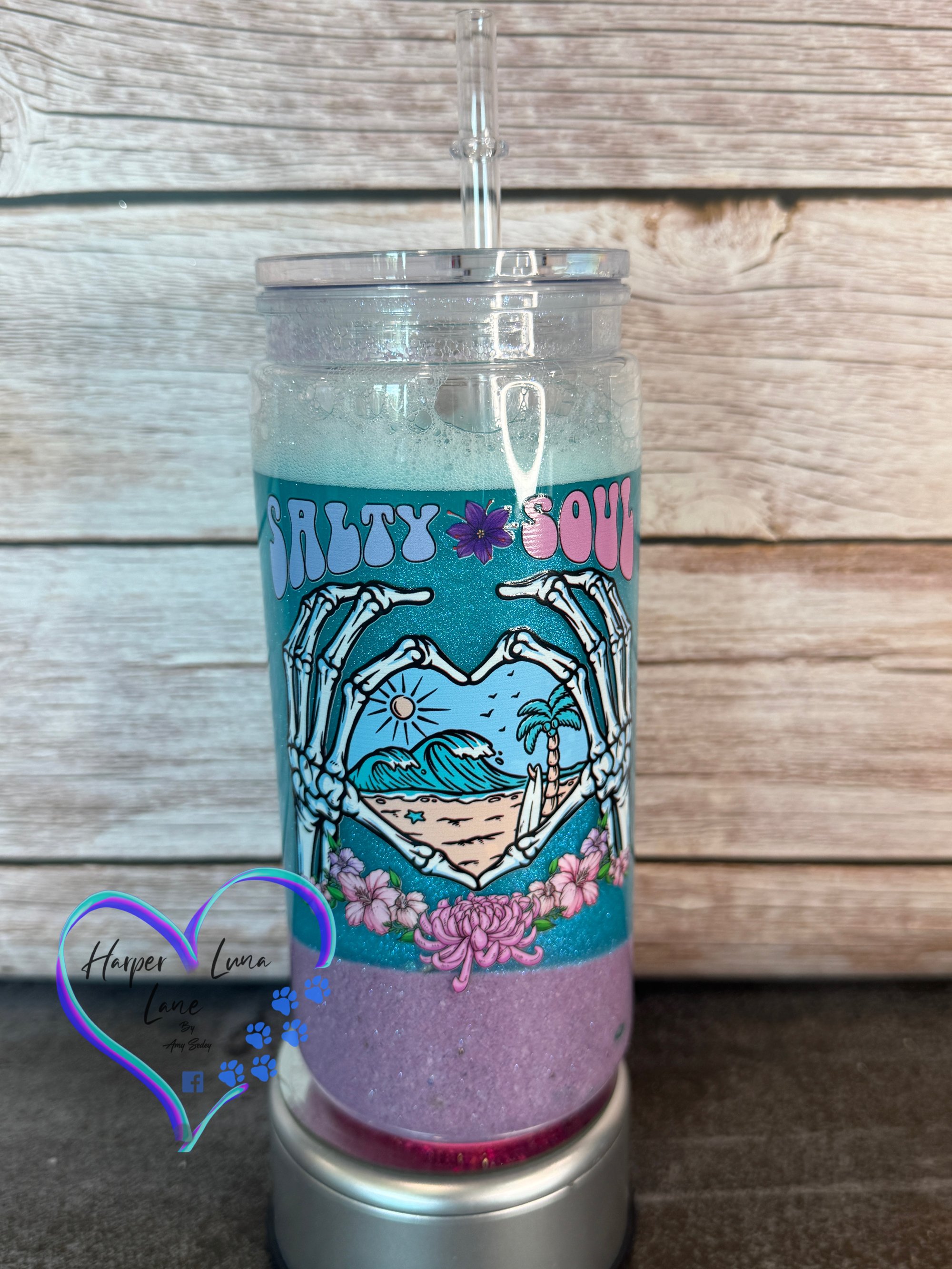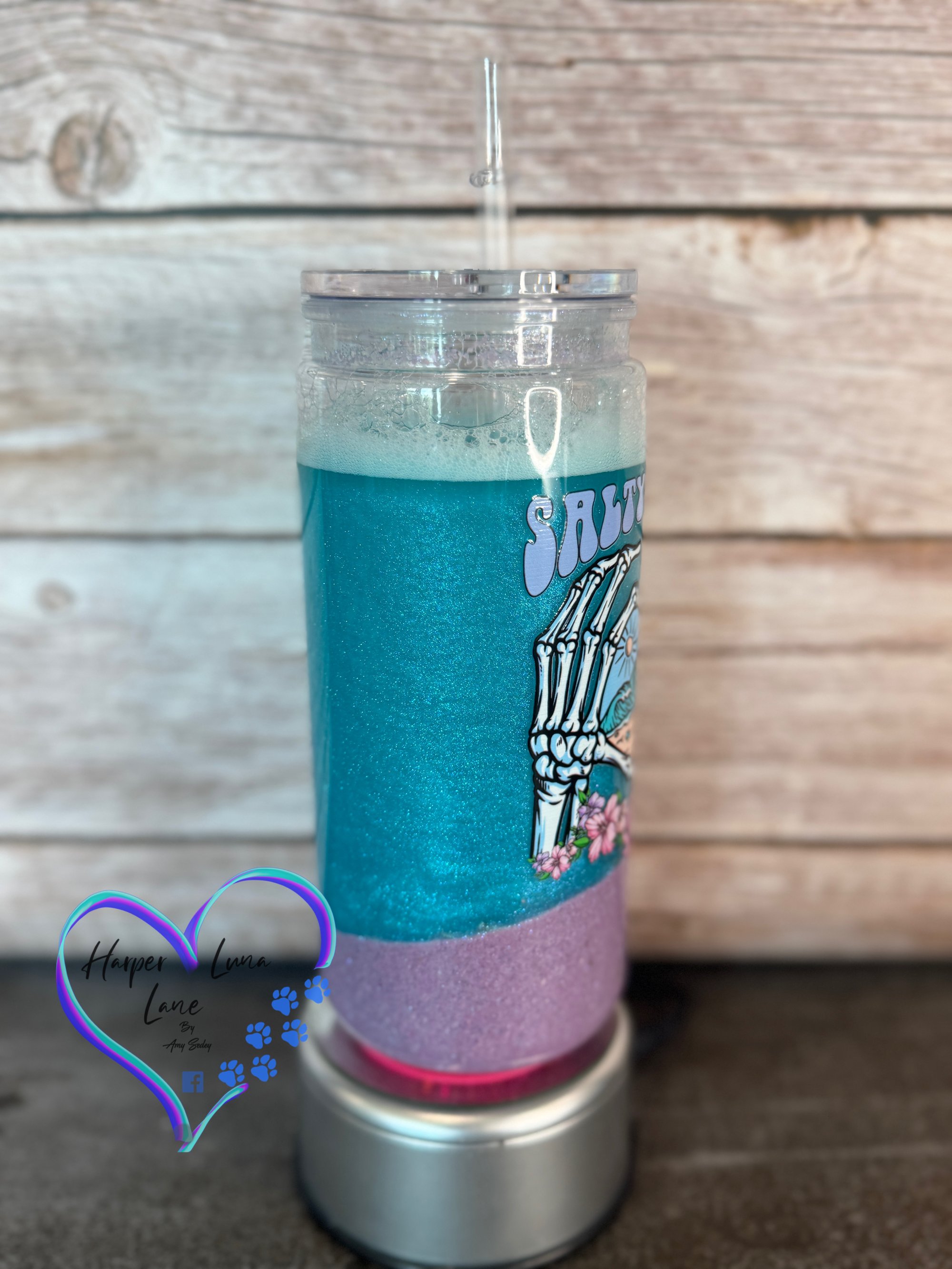This is a unique snow globe style tumbler filled with sand, shells and colored shimmer fluid in the double walled acrylic tumbler.