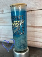 This is a unique snow globe style tumbler filled with sand, shells and colored shimmer fluid in the double walled glass tumbler.