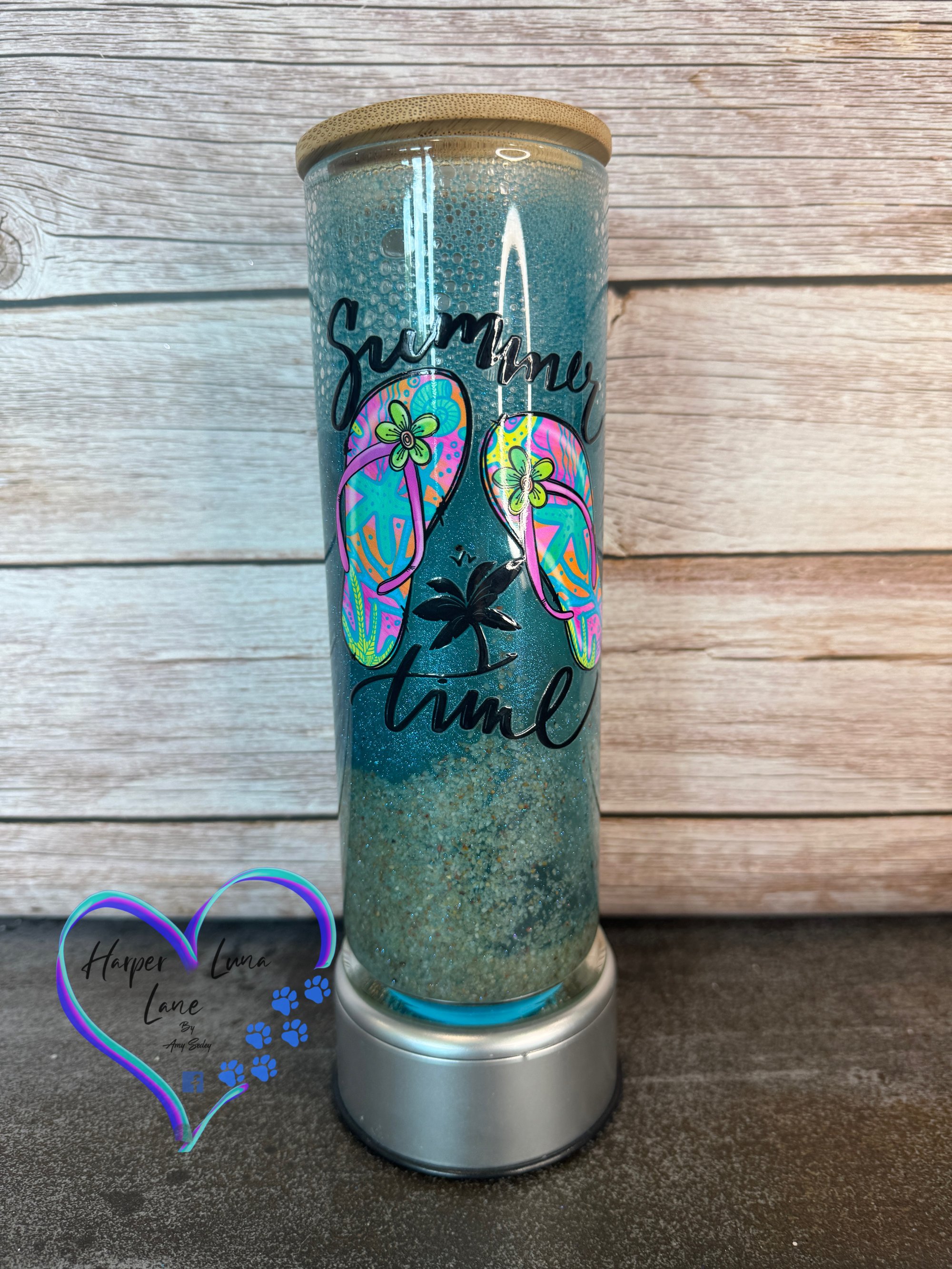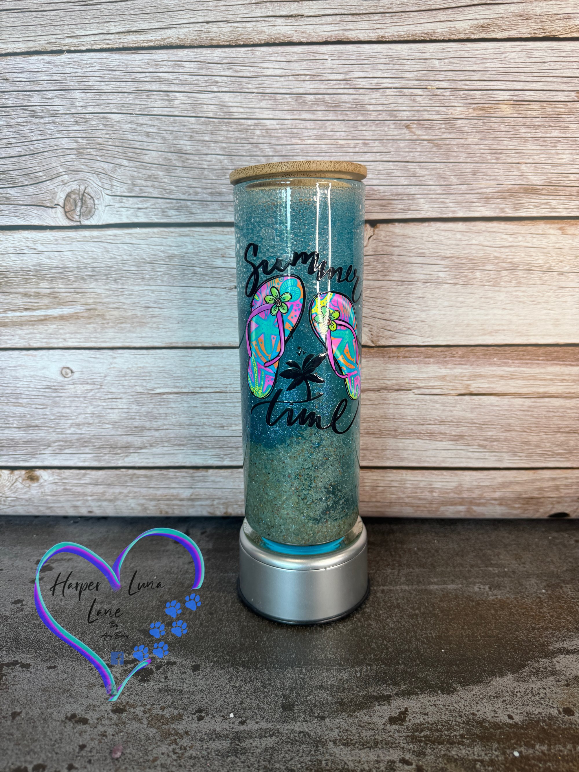 This is a unique snow globe style tumbler filled with sand, shells and colored shimmer fluid in the double walled glass tumbler.